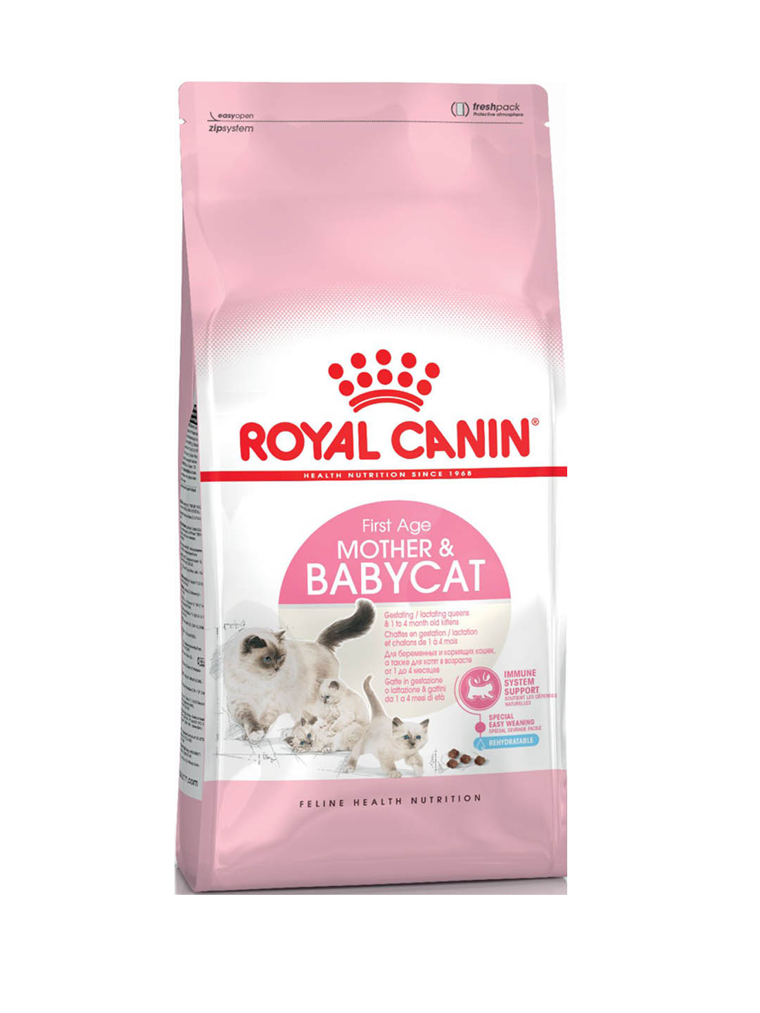 Εάν η γάτα σας είναι έγκυος ή έχει γεννηθεί πρόσφατα, είναι σημαντικό ότι τόσο η ίδια όσο και τα γατάκια της έχουν τη σωστή διατροφική υποστήριξη για να εξασφαλίσουν τη συνεχή υγεία για τη μητέρα και την καλύτερη δυνατή έναρξη για τα γατάκια. Το ROYAL CANIN® Mother & Babycat έχει διαμορφωθεί με βάση τις διατροφικές ανάγκες της μητέρας και των γατών της. Κατάλληλο για θηλάζουσες γάτες καθώς και γατάκια ηλικίας 1-4 μηνών, περιέχει ένα πατενταρισμένο σύμπλεγμα αντιοξειδωτικών που βοηθούν στη στήριξη των φυσικών αμυνών στα γατάκια. Η απαλή υφή της κροκέτας καθιστά εύκολο για τα γατάκια να μασούν και να καταπιούν, επιτρέποντάς τους να συνηθίσουν την στερεά τροφή ως μέρος της διατροφής τους. Το ROYAL CANIN® Mother & Babycat είναι ειδικά ενισχυμένο για την πεπτική ανοχή καθώς μειώνει την ποσότητα των θρεπτικών ουσιών που δεν έχουν υποστεί βλάβη. Είναι εμπλουτισμένο με DHA, το οποίο είναι ένα φυσικό λιπαρό οξύ ωμέγα-3 που βοηθά στην εγκεφαλική ανάπτυξη της γάτας σας.