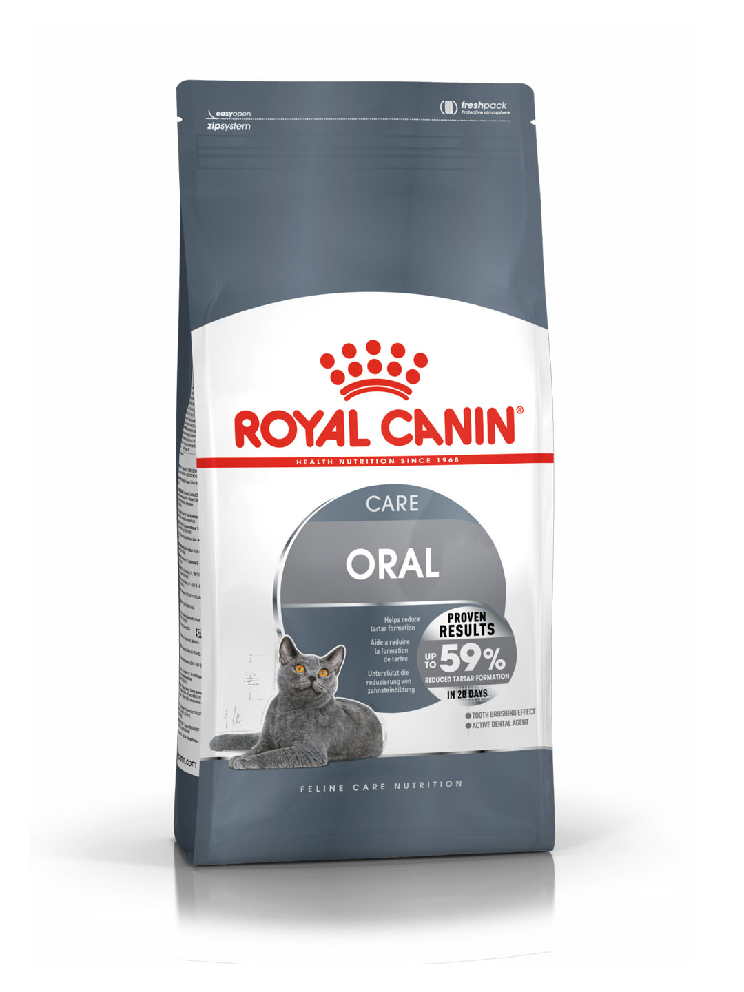 Το ROYAL CANIN® Oral Care είναι μια ακριβής ισορροπημένη διατροφική φόρμουλα που βοηθά στη διατήρηση της στοματικής υγείας της γάτας σας μειώνοντας τον σχηματισμό της οδοντικής πλάκας. Περιέχει επίσης υψηλή περιεκτικότητα σε πρωτεΐνες για να στηρίξει και να ενισχύσει τους μυς, τα οστά και τα δόντια της γάτας σας. Όταν αναζητάτε μια δίαιτα που ωφελεί τα δόντια της γάτας σας και είναι γευστική, είναι σημαντικό να γνωρίζετε ότι η ROYAL CANIN® Oral Care εκτελεί δύο δράσεις: μηχανική και χημική. Το ROYAL CANIN® Oral Care είναι ειδικά σχεδιασμένο για στοχοθετημένη δράση, με το μέγεθος, το σχήμα και το σχήμα της κροκέτας να ενθαρρύνει τις γάτες να μασήσουν καλά. Αυτή η μηχανική δράση παράγει ένα καθημερινό αποτέλεσμα βουρτσίσματος των δοντιών που βοηθά στη μείωση του σχηματισμού οδοντικής πλάκας στα δόντια.Αυτή η φόρμουλα εμπλουτίζεται επίσης με ένα ενεργό οδοντικό παράγοντα (χηλικοί παράγοντες ασβεστίου) που εκτελεί μια χημική δράση παγιδεύοντας το ασβέστιο στο σάλιο για να βοηθήσει στον περιορισμό της οδοντιατρικής πλάκας. Το ROYAL CANIN® Oral Care έχει αποδειχθεί κλινικά ότι δείχνει αποτελέσματα μετά από μόλις 28 ημέρες συνεχούς χρήσης, μειώνοντας μέχρι και το 59% του σχηματισμού πέτρας.