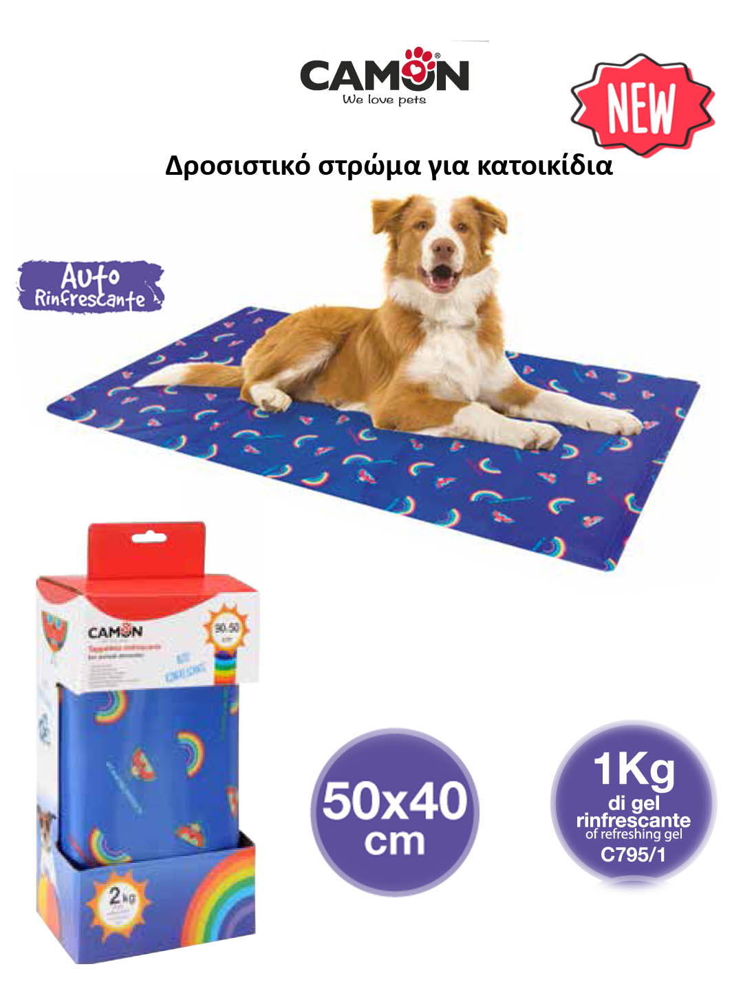 Το cooling mat Camon είναι ένα αυτό-δροσιζόμενο στρώμα από γέλη (τζελ) το οποίο διατηρεί το κατοικίδιο σας δροσερό, διατηρώντας τη σωστή θερμοκρασία σώματος. Μπορεί να χρησιμοποιηθεί τόσο σε εσωτερικούς όσο και σε εξωτερικούς