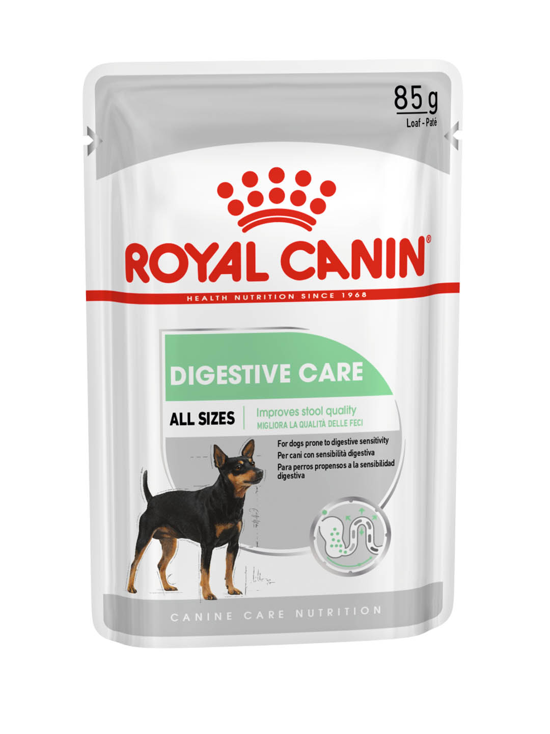 Η πεπτική δυσφορία δεν είναι διασκεδαστική για κανέναν, συμπεριλαμβανομένου του σκύλου σας. Μια δίαιτα που περιέχει υψηλής ποιότητας θρεπτικά συστατικά συμβάλλει όχι μόνο στην εντερική άνεση του σκύλου σας, αλλά και στη γενική ευημερία του. Το ROYAL CANIN® Digestive Care είναι κατάλληλο για σκύλους όλων των μεγεθών. Το ROYAL CANIN® Digestive Care περιέχει εξαιρετικά εύπεπτες πρωτεΐνες, καθώς και ένα μείγμα πρεβιοτικών και ινών για ισορροπημένη εντερική χλωρίδα - συμβάλλοντας τελικά στην προώθηση της βέλτιστης ποιότητας κοπράνων. Η Royal Canin εστιάζει στις πρωτεΐνες πολύ σοβαρά, γι 'αυτό χρησιμοποιούμε μόνο τις πρωτεΐνες της υψηλότερης ποιότητας, προσαρμοσμένες στις ακριβείς ανάγκες του σκύλου σας. Το ROYAL CANIN® Digestive Care περιέχει εύπεπτες πρωτεΐνες γνωστές ως L.I.Ps, καθώς και μια σειρά πρεβιοτικών για υγιή εντερική χλωρίδα. Επιπλέον, μια ακριβής ισορροπία διαλυτών και αδιάλυτων ινών συμπεριλαμβάνεται για να βοηθήσει στον περιορισμό της ζύμωσης και να στηρίξει την υγιή εντερική διέλευση. Εκτός από αυτό το νόστιμο πατέ, το πρόγραμμα διατροφής Digestive Care διατίθεται επίσης σε τραγανές κροκέτες. Γιατί να μην δοκιμάσετε το πατέ όπως μια νόστιμη επίστρωση στις κροκέτες;