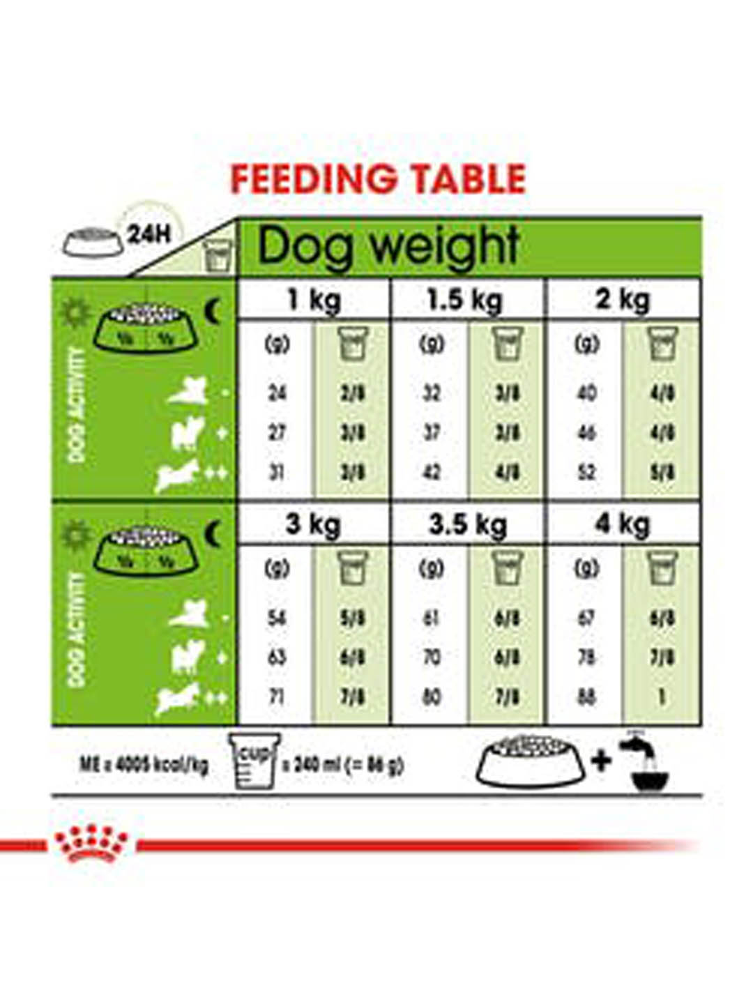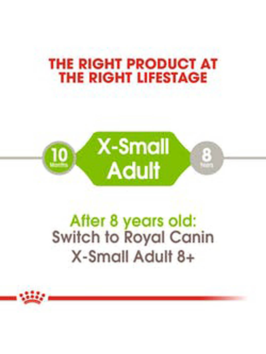 Κατάλληλο για πολύ μικρόσωμους σκύλους ηλικίας άνω των 10 μηνών που ζυγίζουν έως και 4 κιλά, το ROYAL CANIN® X-Small Adult είναι ειδικά διαμορφωμένο με όλες τις διατροφικές ανάγκες του σκύλου X-Small. Το ROYAL CANIN® X-Small Adult περιέχει πρωτεΐνη πολύ υψηλής ποιότητας (L.I.P.), ειδικά επιλεγμένη για την εύκολη αφομοιωσιμότητά του. Αυτή η πρωτεΐνη, σε συνδυασμό με μια ισορροπημένη πρόσληψη ινών όπως το psyllium, βοηθά στη διευκόλυνση της υγιούς εντερικής διαμετακόμισης. Επιπλέον, το ROYAL CANIN® X-Small Adult βοηθά στην υποστήριξη ενός υγιούς ουροποιητικού συστήματος σε πολύ μικρόσωμες φυλές σκυλιών, όπως η δική σας. Εμπλουτισμένο με ωμέγα-3 λιπαρά οξέα (EPA και DHA), το ROYAL CANIN® X-Small Adult βοηθά στην υποστήριξη της καλής κατάστασης του τριχώματος. Ενώ η ποικιλία των βιταμινών που περιλαμβάνονται συμβάλλει στην ενίσχυση του ρόλου του δέρματος του σκύλου σας - συμβάλλοντας τελικά στη διατήρηση της υγιούς επιδερμίδας. Η κροκέτα στο ROYAL CANIN® X-Small Adult έχει ειδικά σχεδιαστεί για να καλύψει τη συγκεκριμένη φυλή. Το σχήμα, το μέγεθος και η υφή του είναι τέλεια για τις μικροσκοπικές σιαγόνες του.